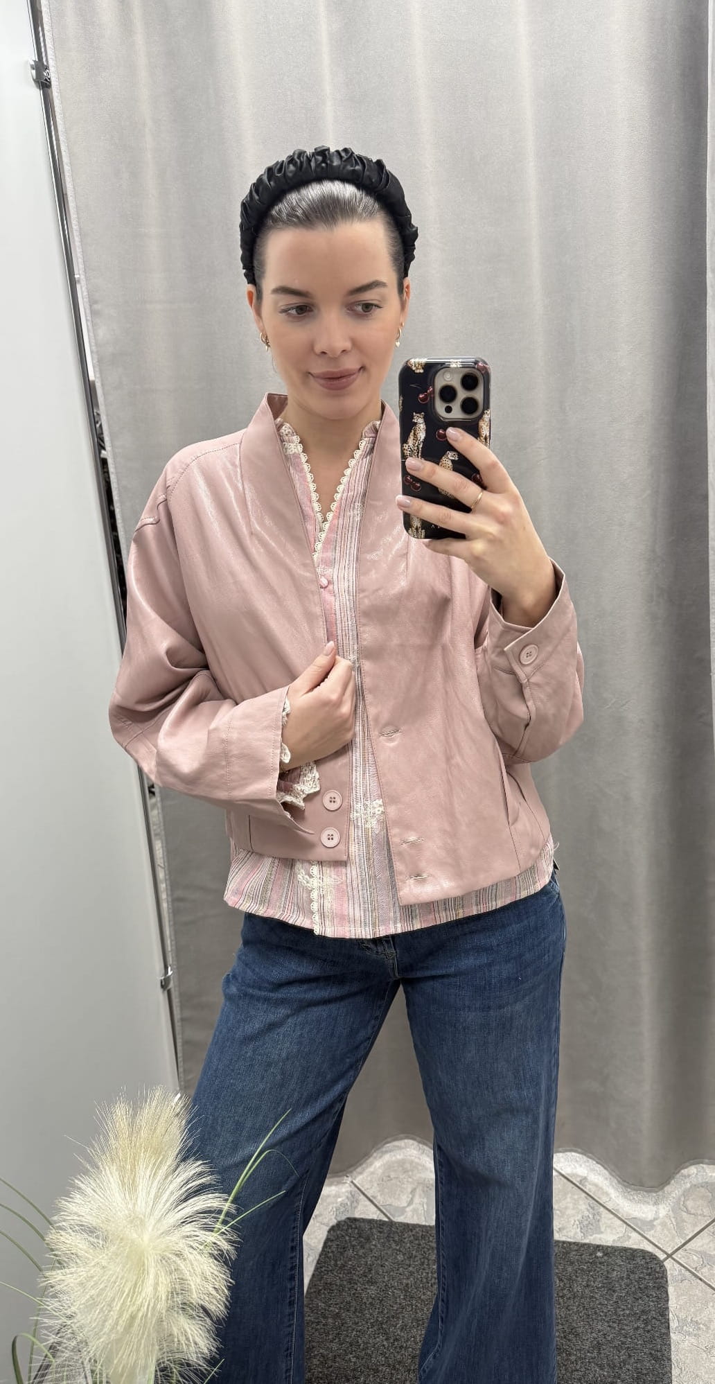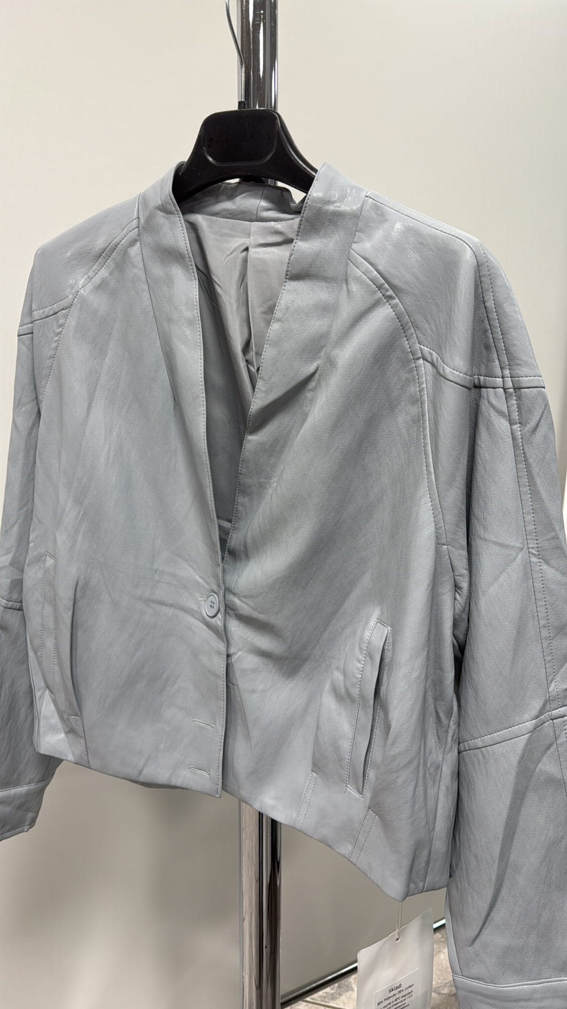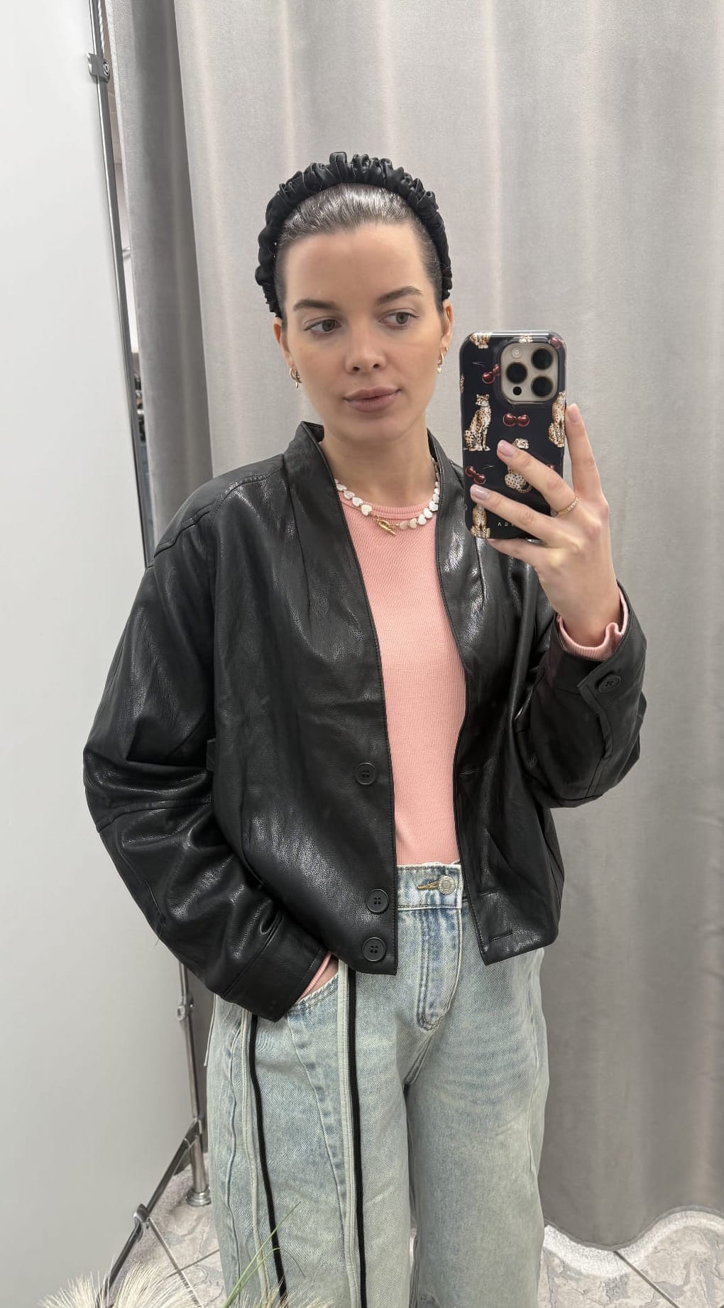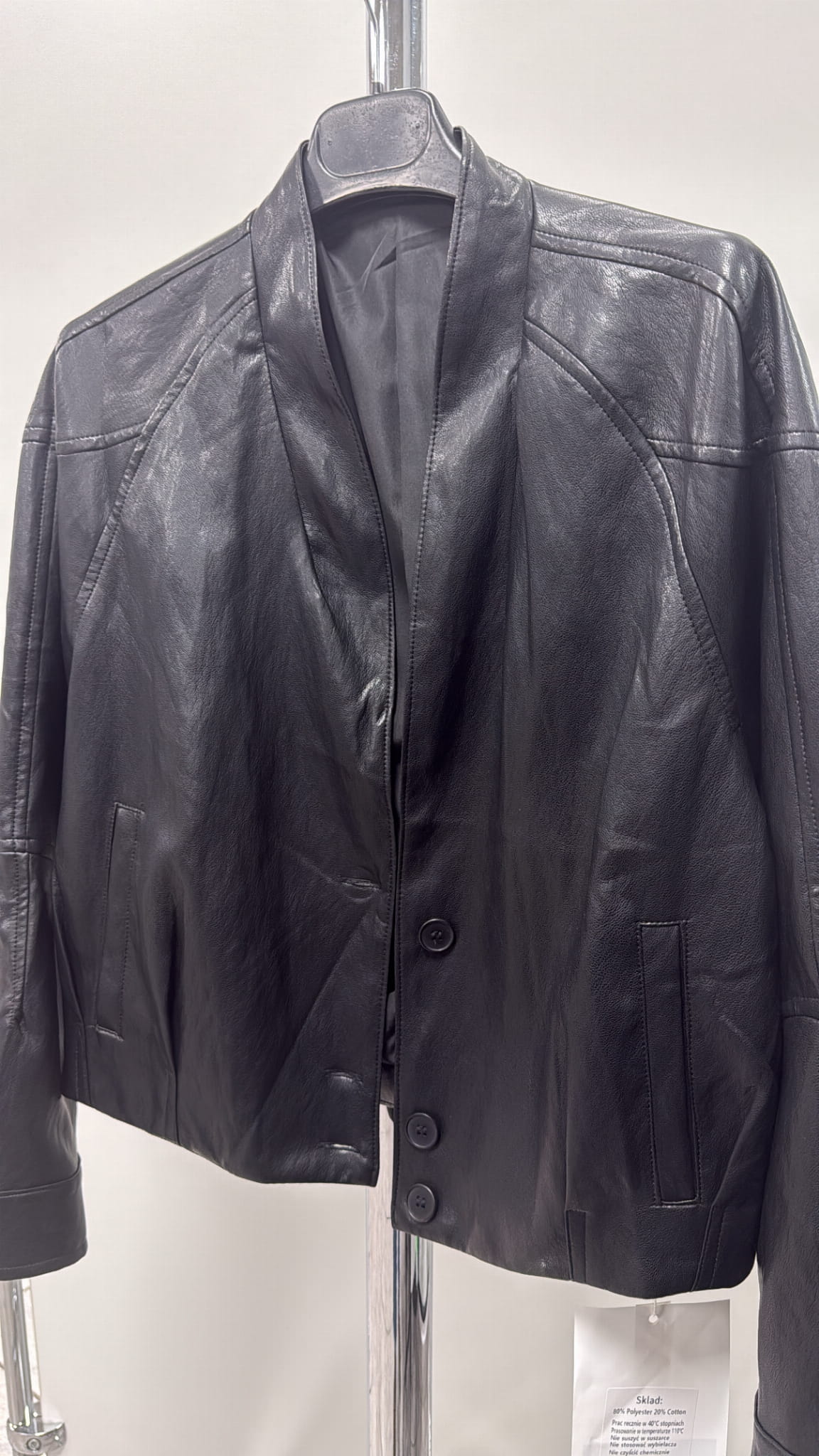 Krótka kurtka w formie żakieciku, wykonana z bardzo miękkiej imitacji skóry (skajki). Zapinana na guziki, z dołem wykończonym gumką. Uniwersalny model o kobiecym, lekko oversize’owym fasonie, polecany dla rozmiarów S, M i L. Dostępna w kilku wariantach kolorystycznych.