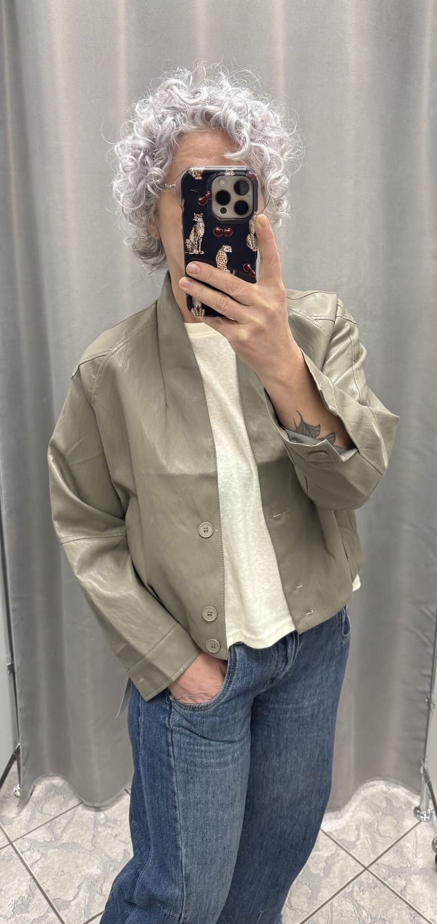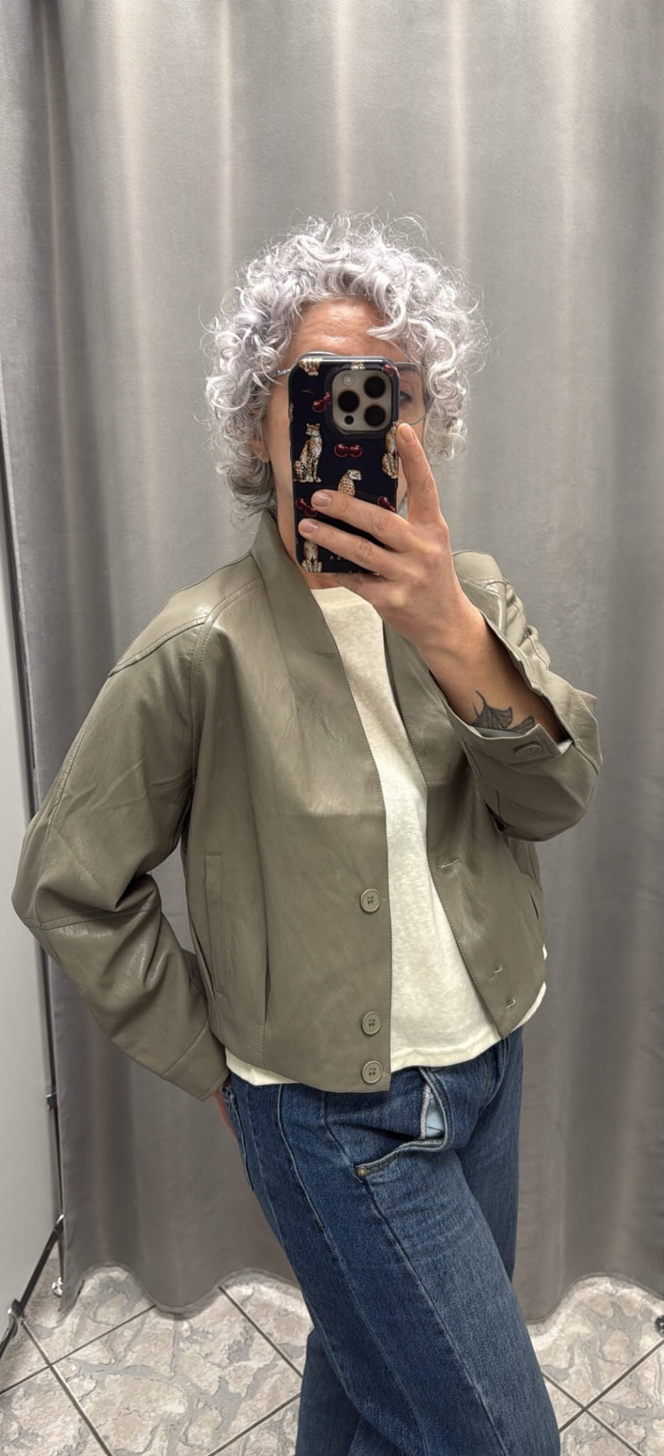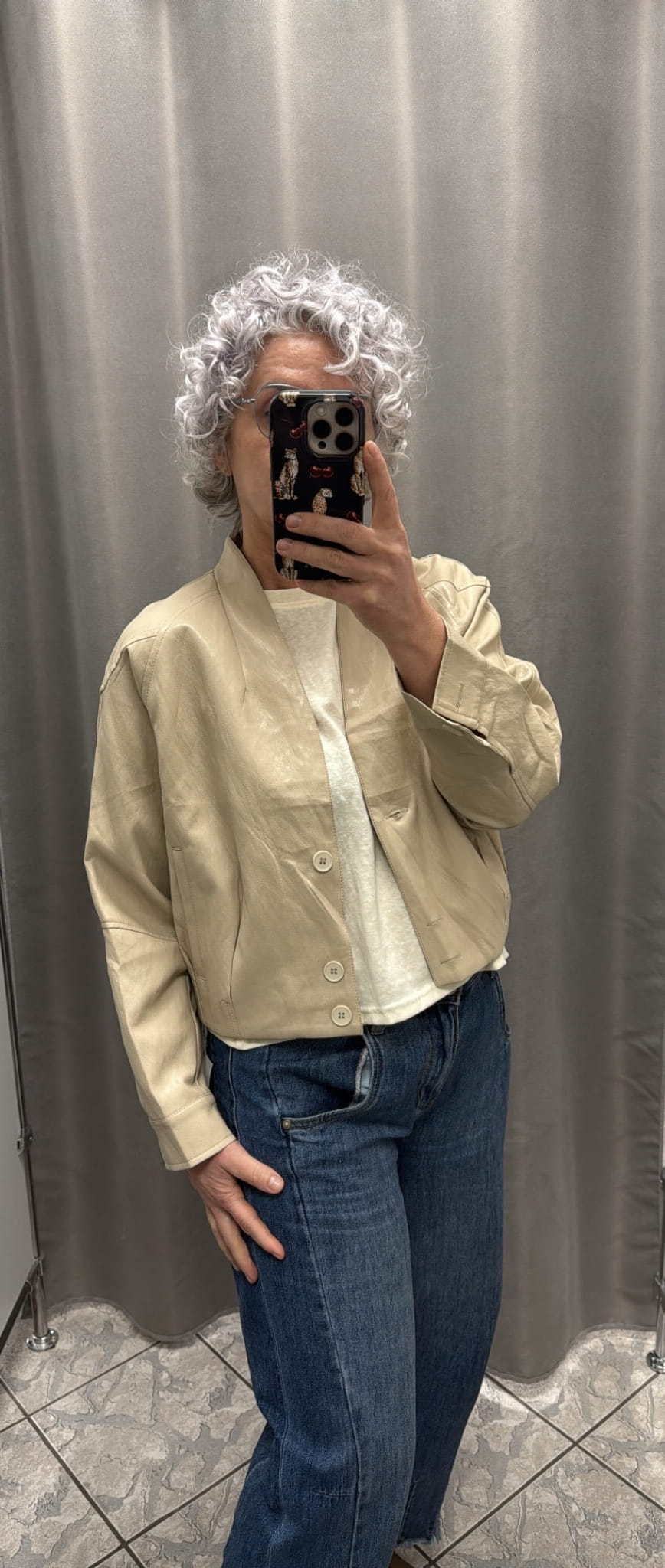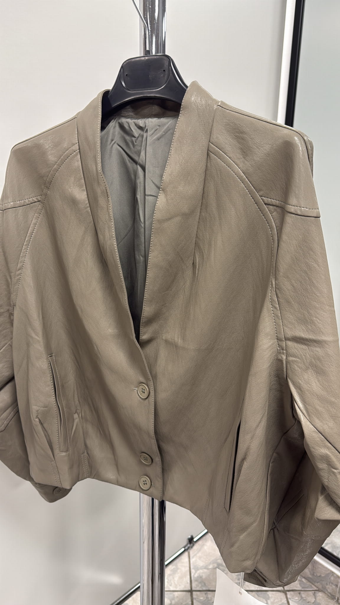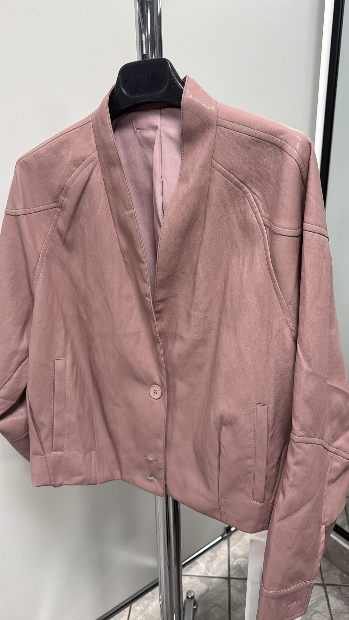 Krótka kurtka w formie żakieciku, wykonana z bardzo miękkiej imitacji skóry (skajki). Zapinana na guziki, z dołem wykończonym gumką. Uniwersalny model o kobiecym, lekko oversize’owym fasonie, polecany dla rozmiarów S, M i L. Dostępna w kilku wariantach kolorystycznych.