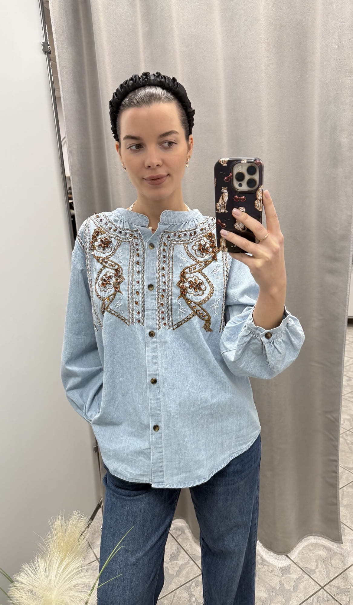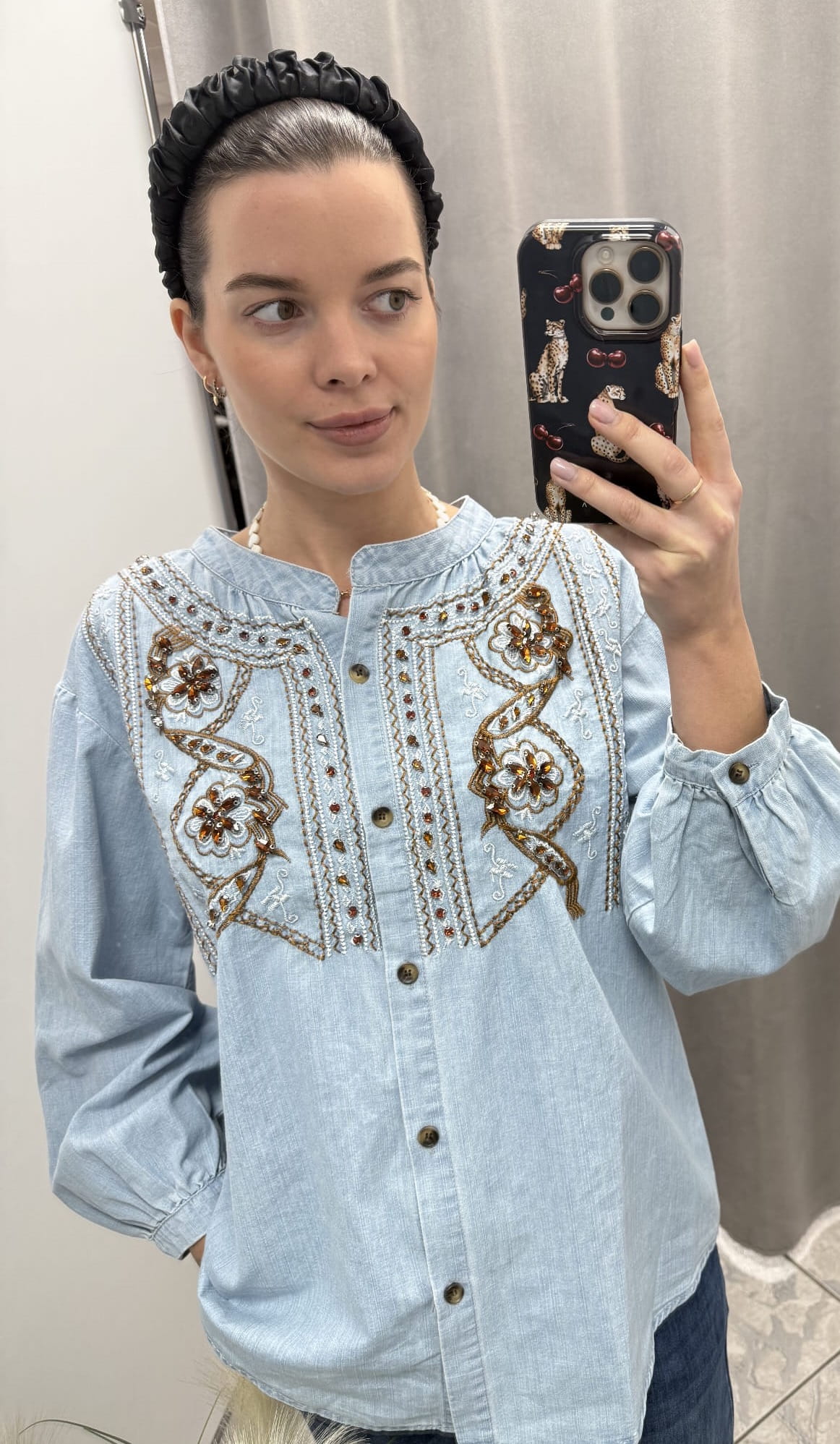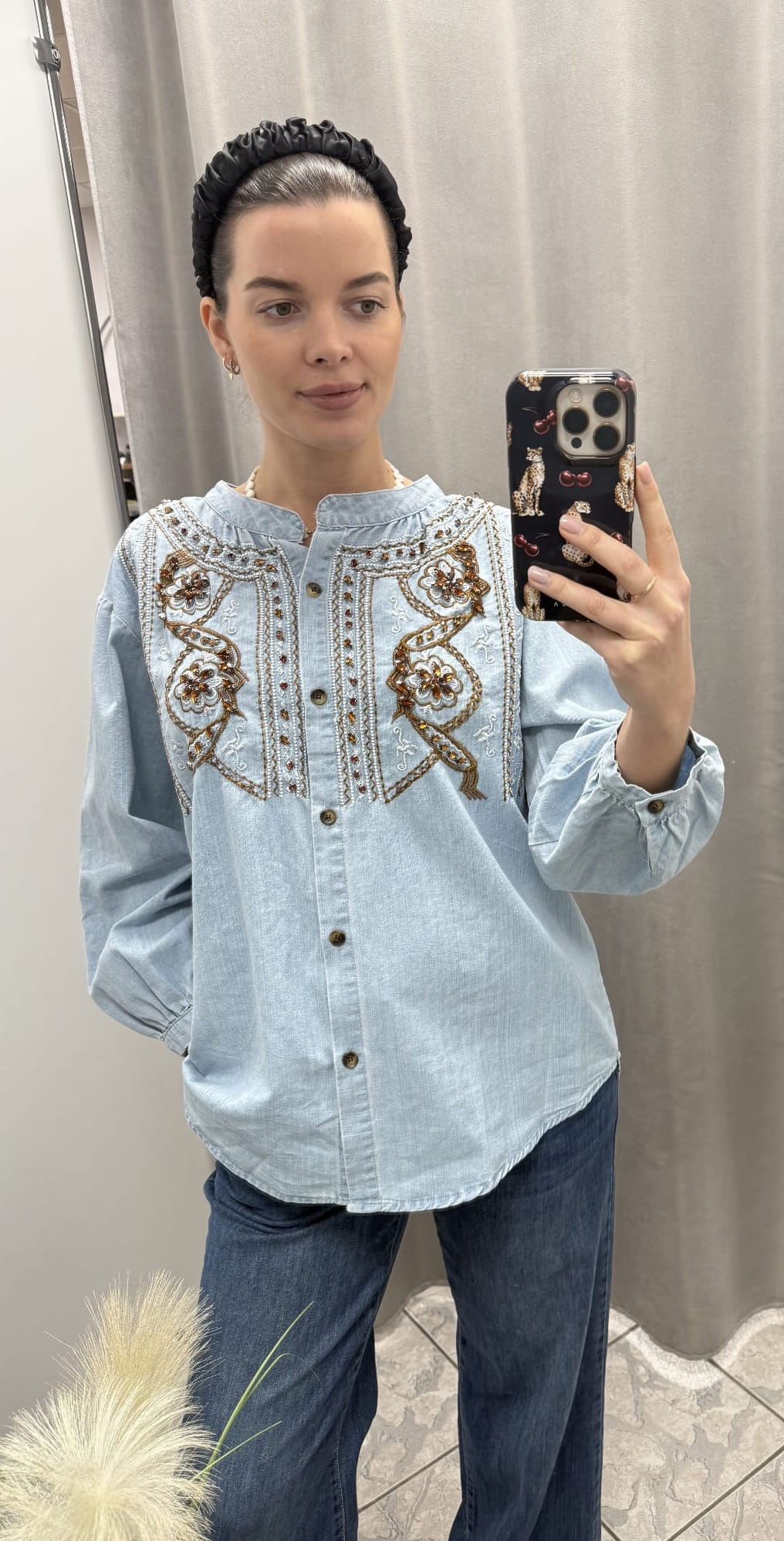 Wyjątkowa bluzka jeansowa, która łączy w sobie swobodny fason z eleganckim, dekoracyjnym wykończeniem. Wykonana z miękkiego, przyjemnego w dotyku denimu w subtelnym, błękitnym odcieniu. Całość zachwyca bogatym haftem wzbogaconym brązowymi kryształkami, które pięknie odbijają światło i nadają bluzce luksusowego charakteru.