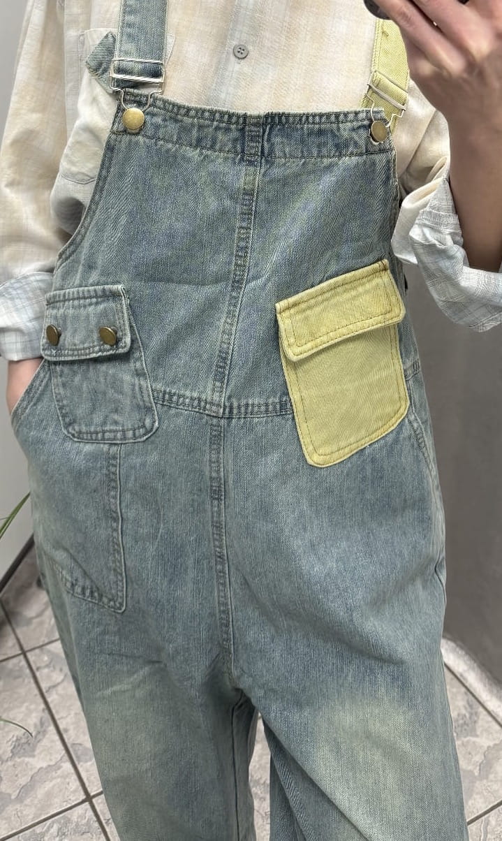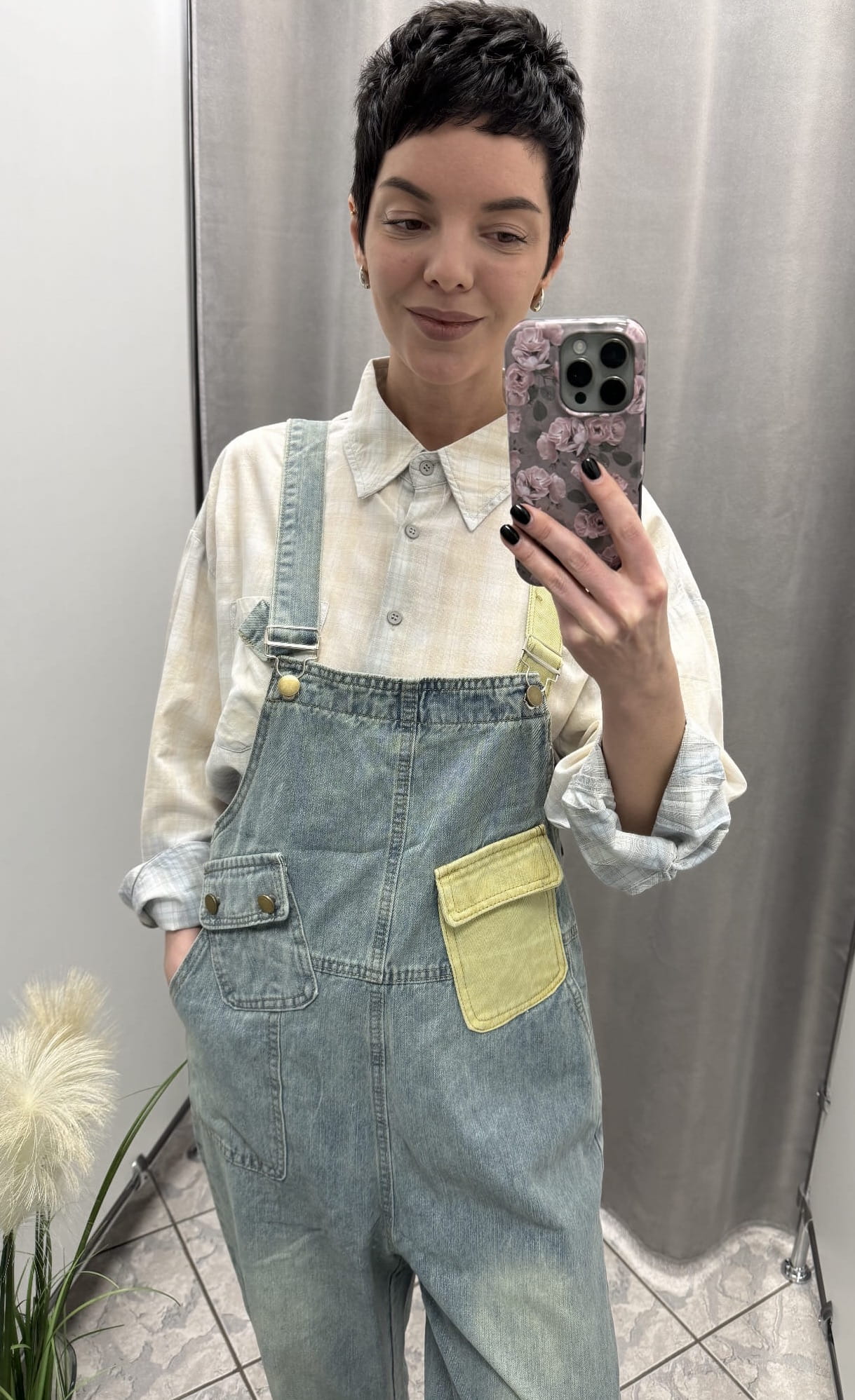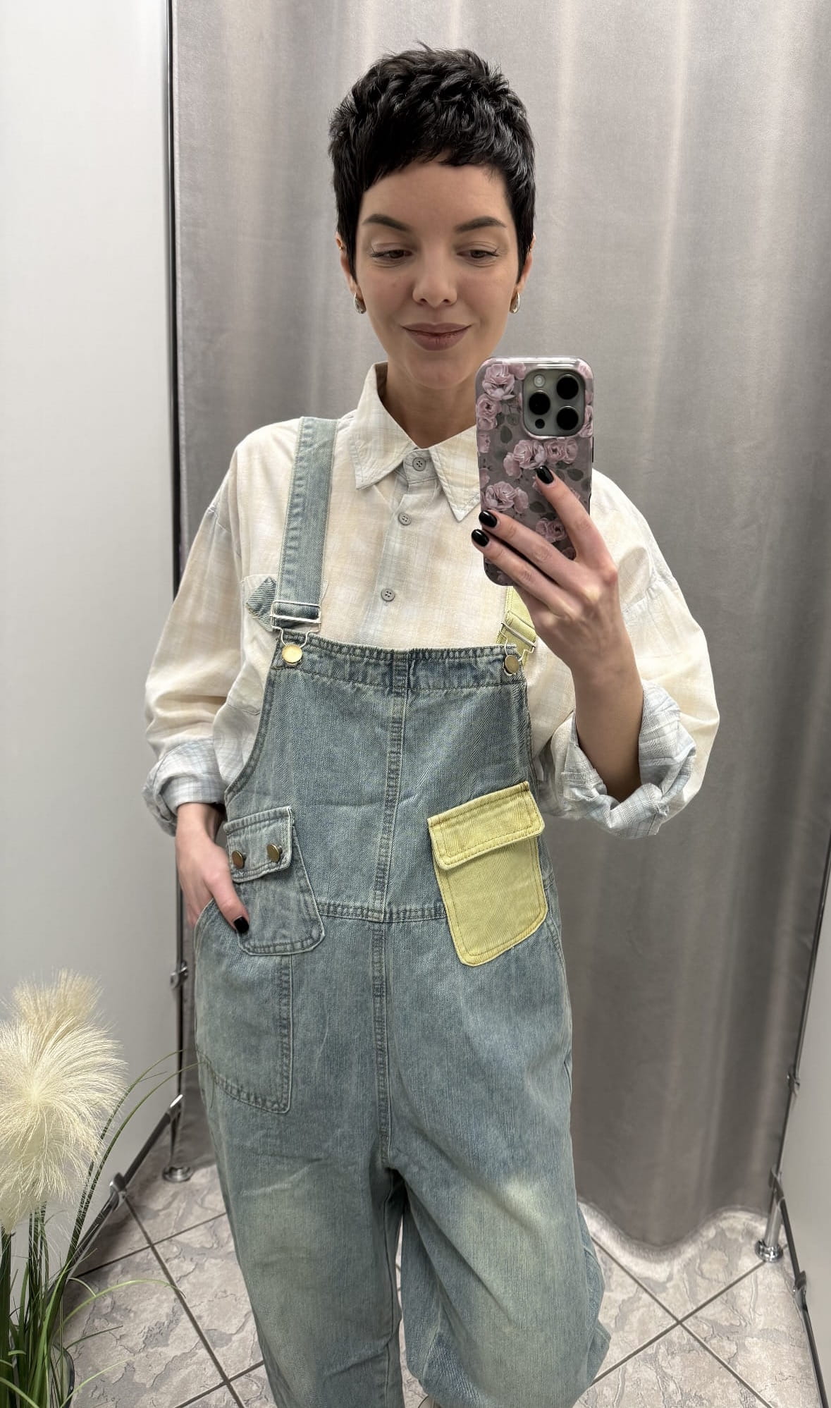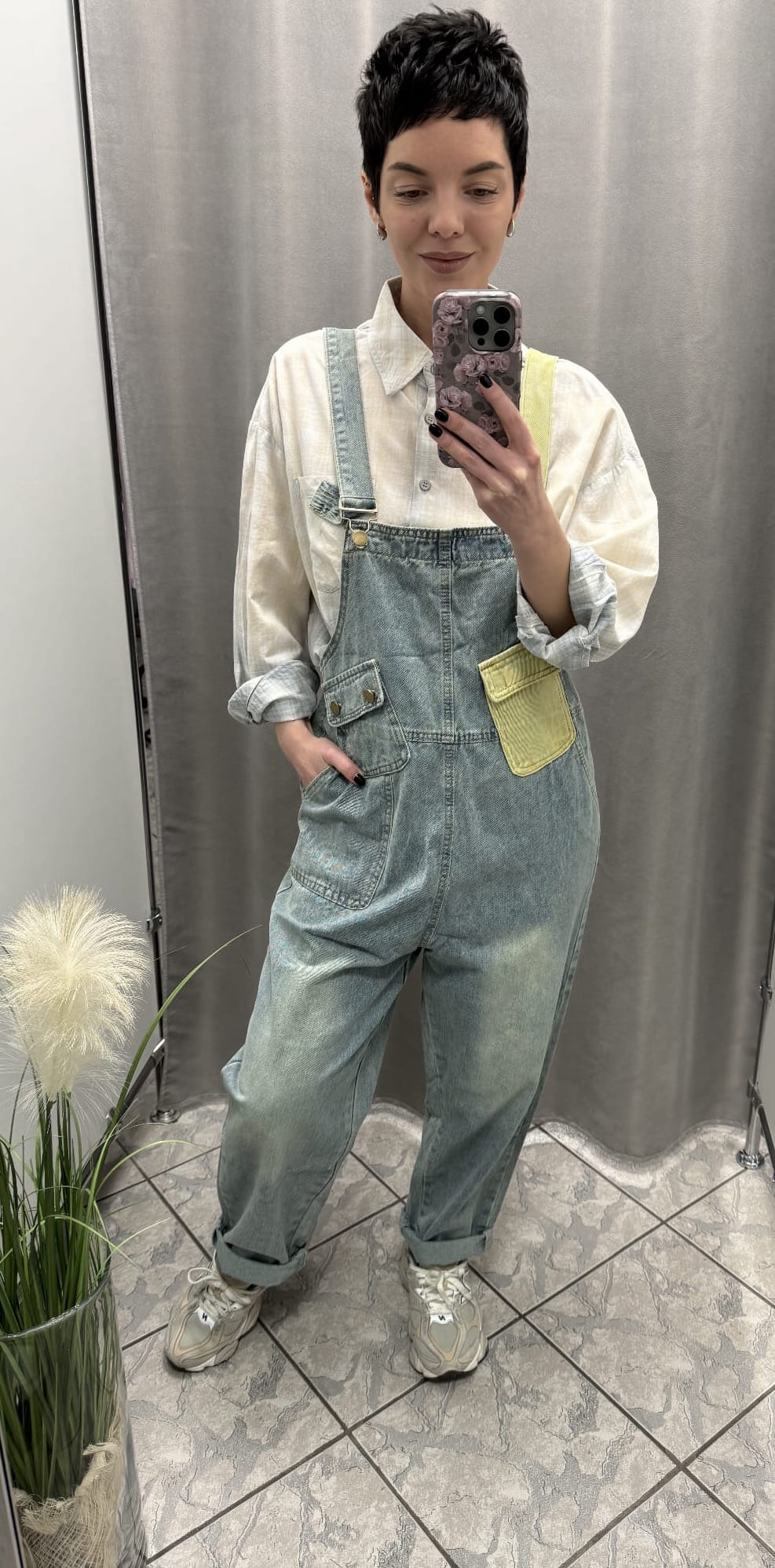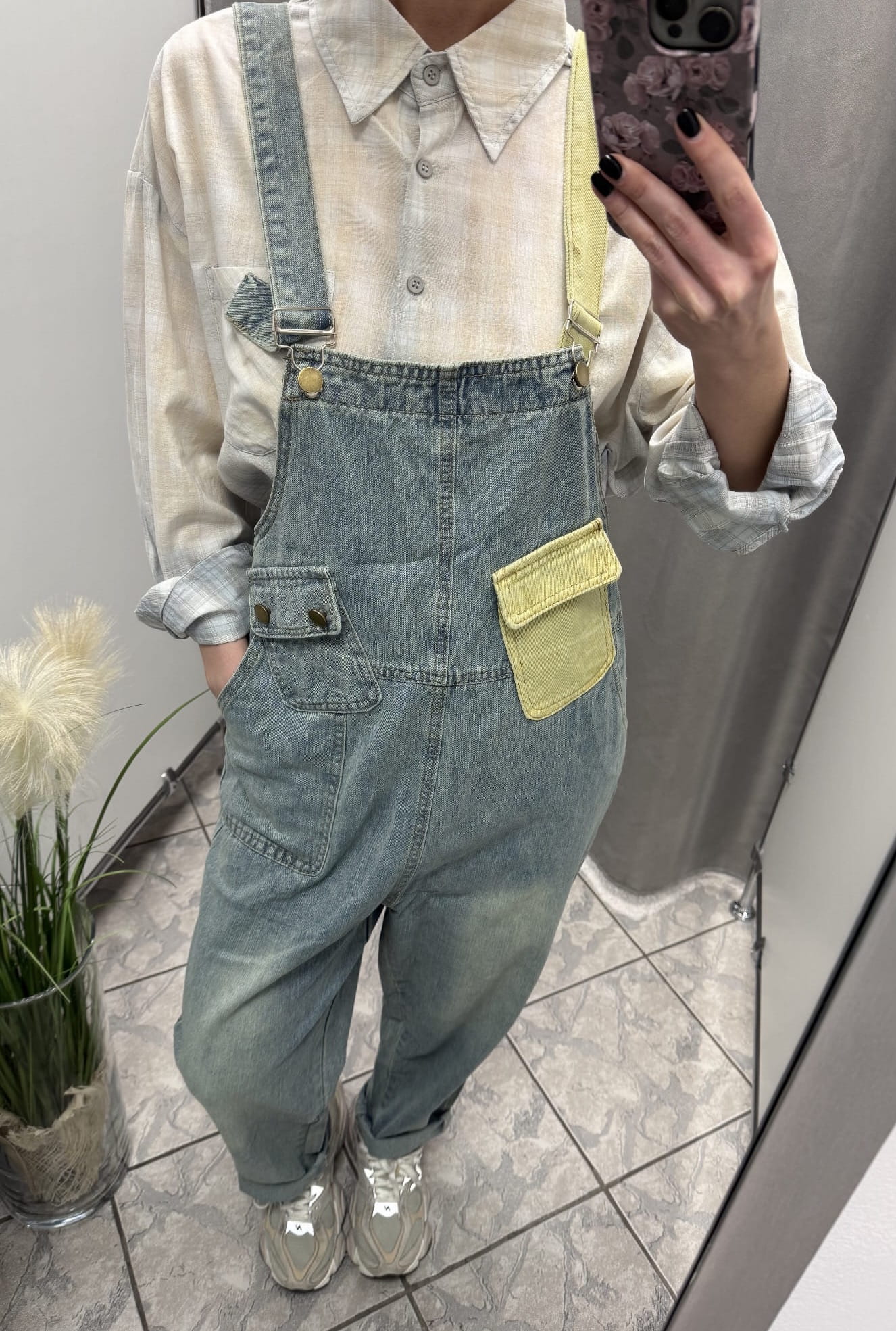 Stylowe dżinsowe ogrodniczki z subtelnym akcentem koloru bananowego na kieszeni i szelce. Wykonane z miękkiego, lekkiego i wygodnego dżinsu. Regulowane szelki zapewniają idealne dopasowanie. Dostępne w rozmiarach L i XL.