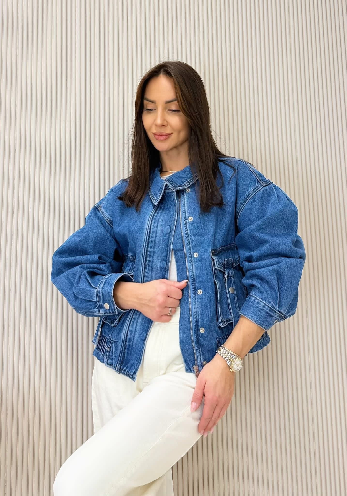 Krótsza jeansowa bomberka VIA z gumą w pasie, zapinana na zamek i napy. Dwie praktyczne kieszenie, fason oversize, rozmiar uniwersalny, klasyczny denim.