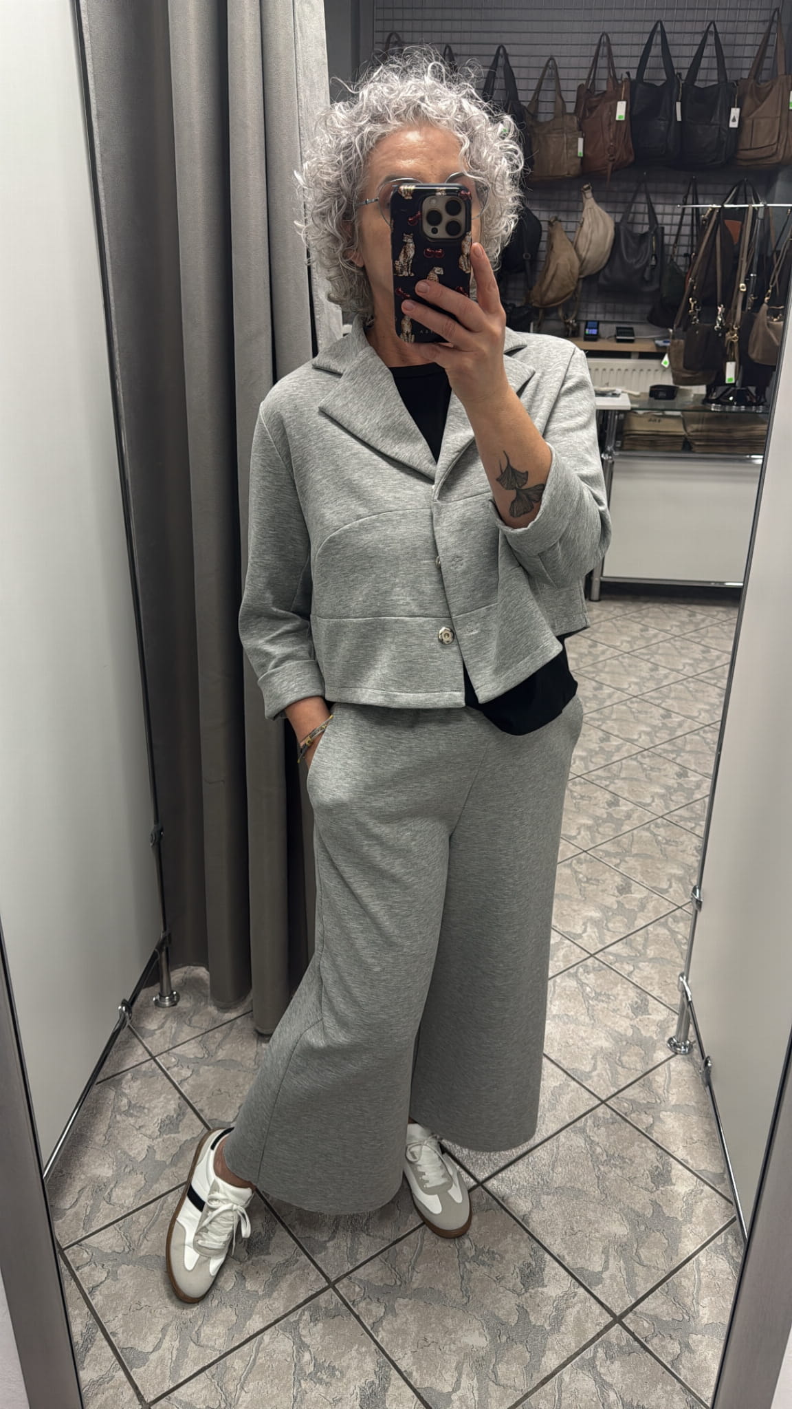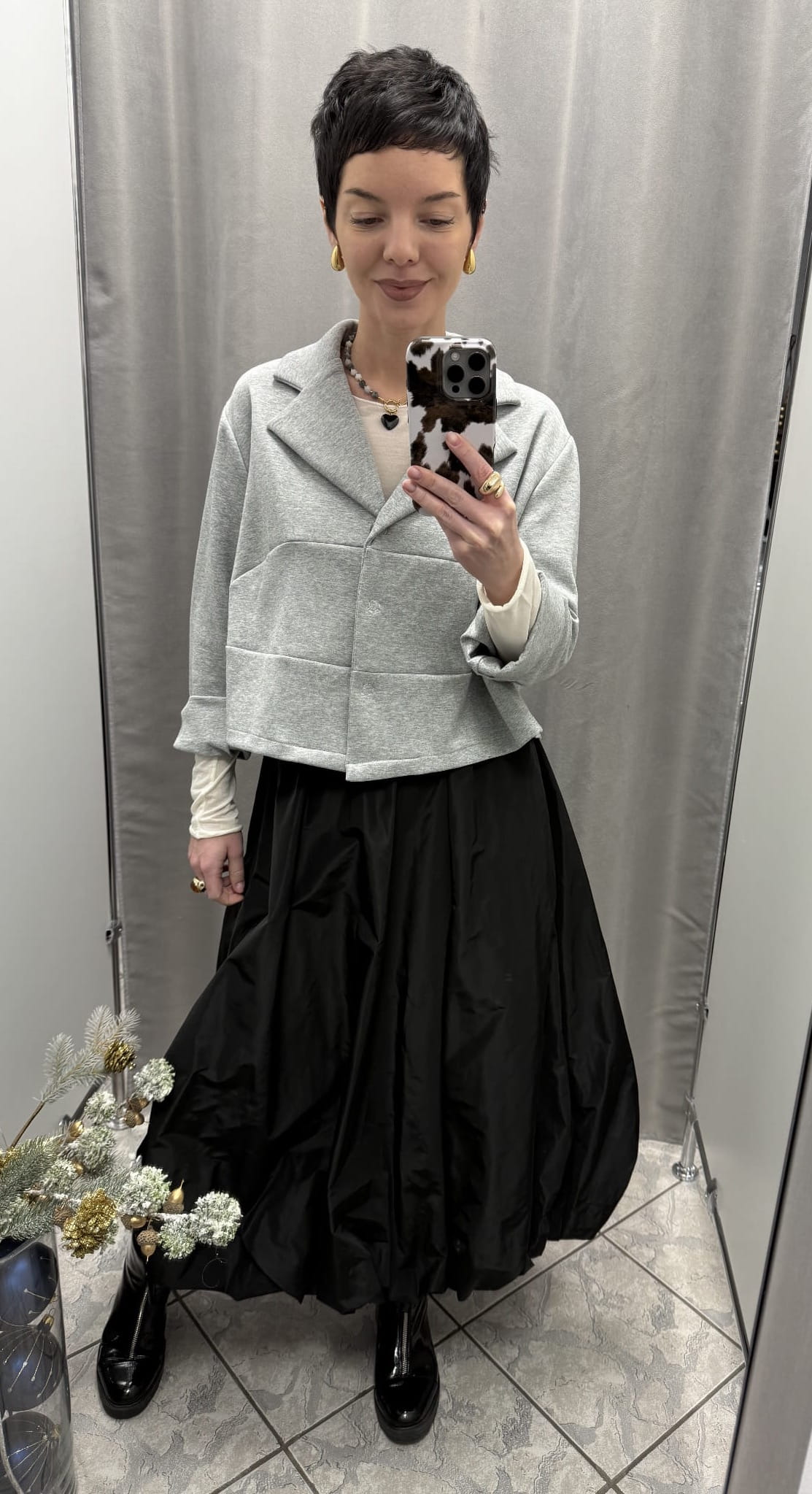 Żakiecik dostępny jest w dwóch odcieniach szarości, co pozwala dopasować go do różnych stylizacji i osobistych preferencji – od jasnych, minimalistycznych zestawów po bardziej kontrastowe, miejskie looki.
