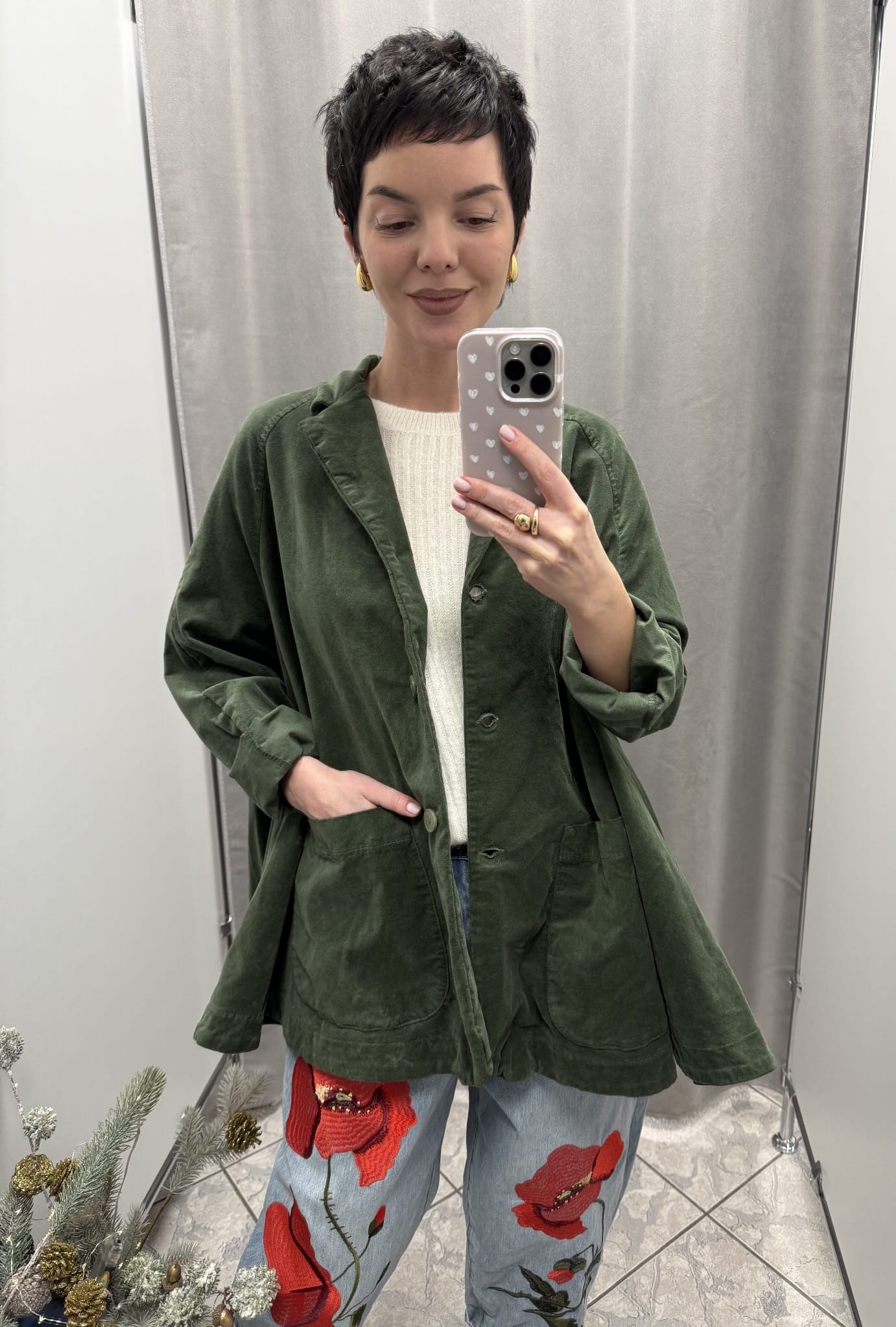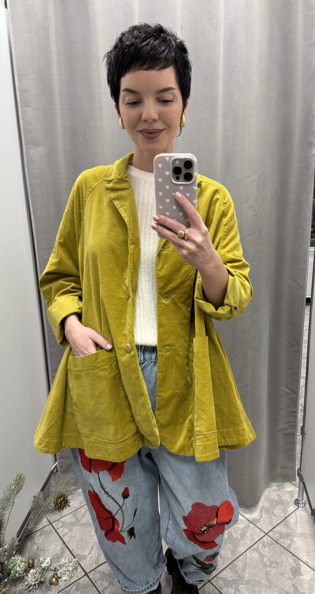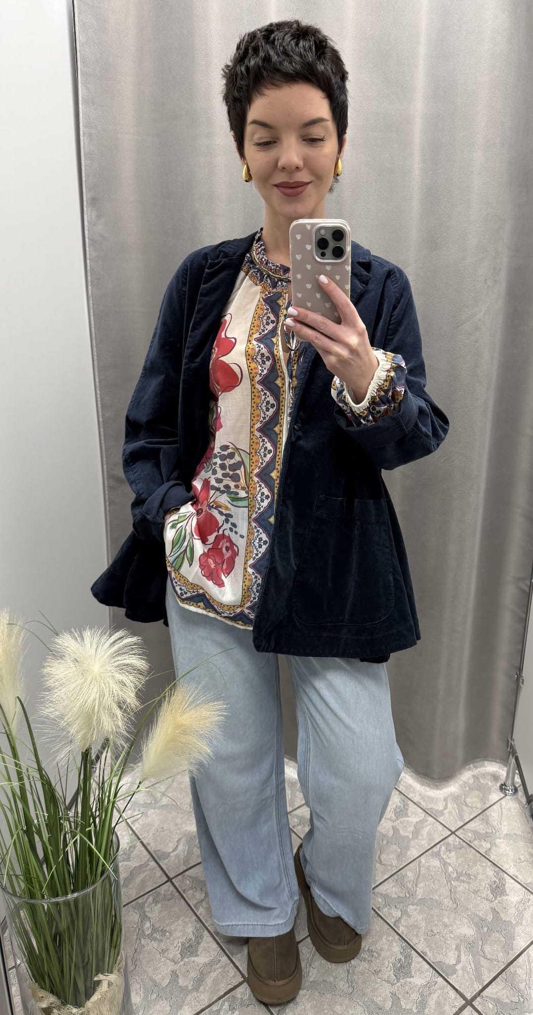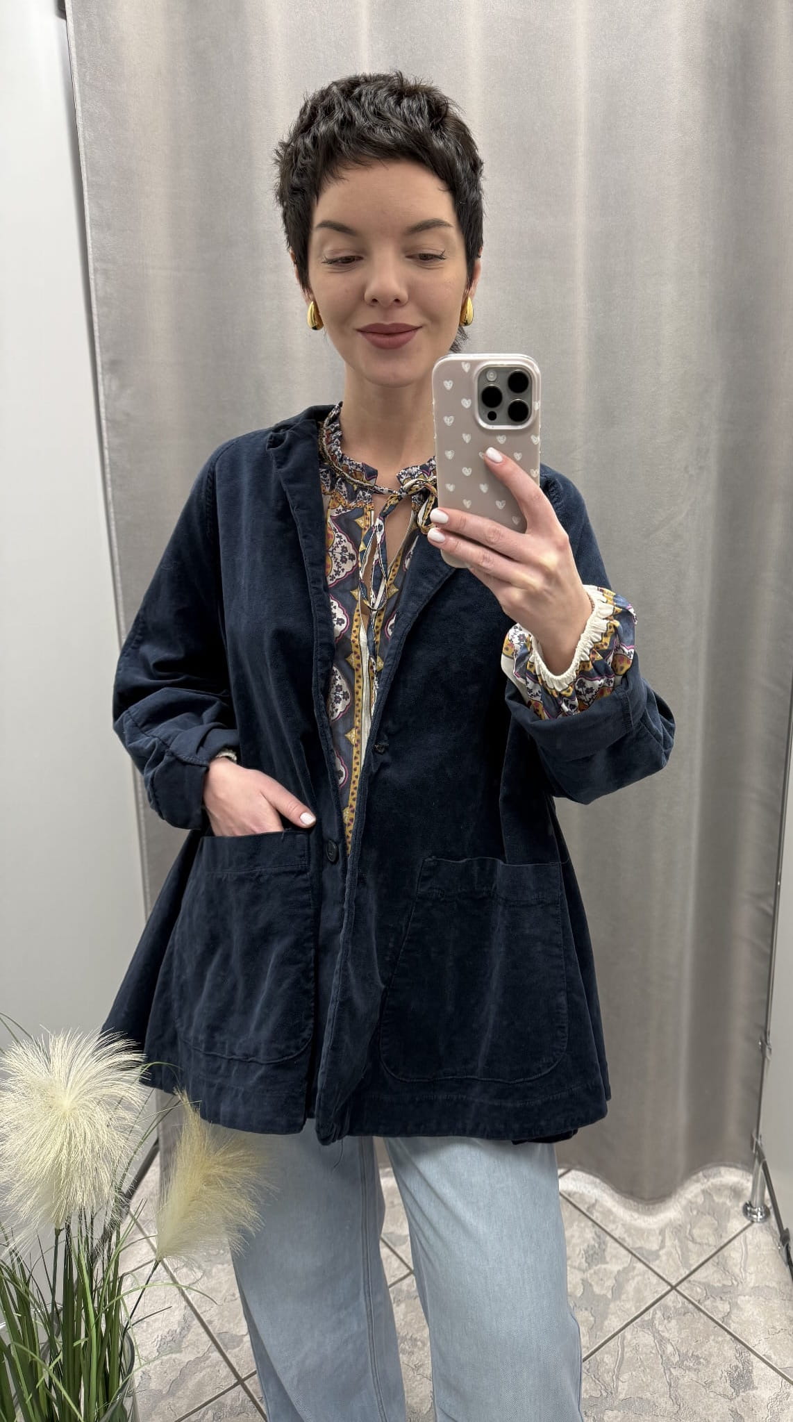 Ten żakiet to połączenie nowoczesnej formy, wygody i subtelnej elegancji. Oversize’owy, pudełkowy krój pięknie układa się na sylwetce, a wyjątkowy tył szyty z półkoła nadaje całości lekkości i efektownego ruchu przy każdym kroku. To model, który przyciąga spojrzenia, a jednocześnie pozostaje niezwykle uniwersalny.