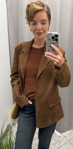 Elegancki i ponadczasowy żakiet w odcieniu wielbłądziej brązu, wykonany z miękkiego zamszu ekologicznego. To idealny element garderoby, który doda Twoim stylizacjom szczypty klasycznej nonszalancji, a jednocześnie jest przyjazny dla środowiska. Doskonale pasuje zarówno do jeansów, jak i bardziej formalnych spodni.