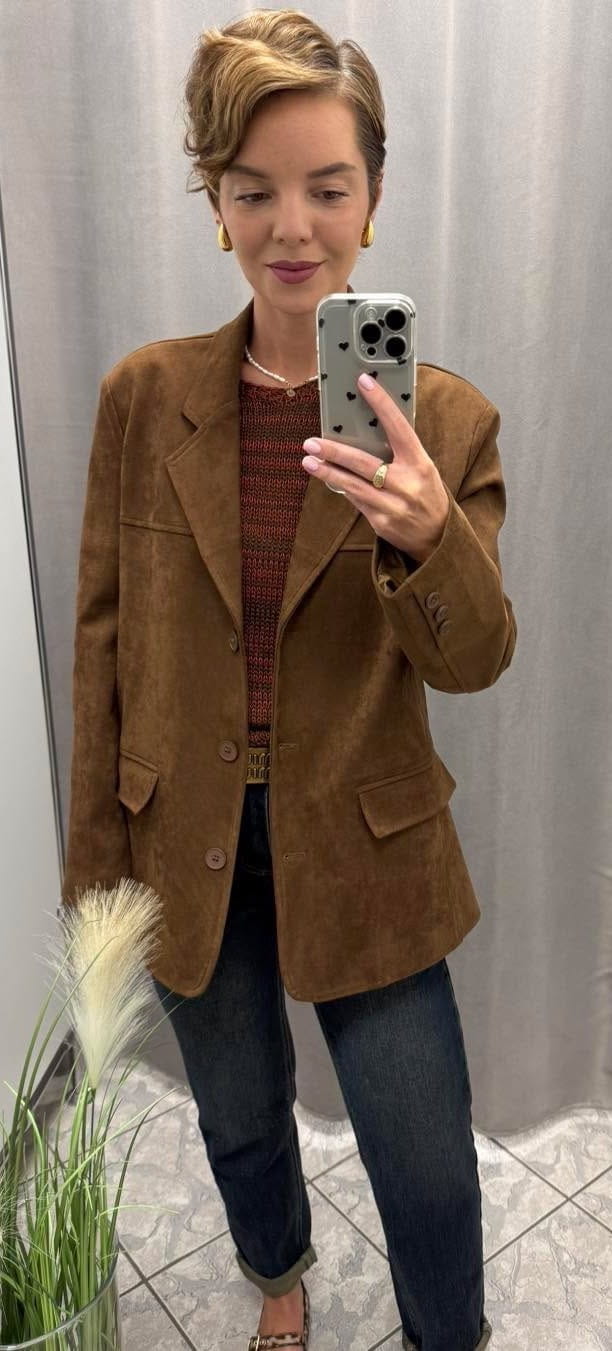Odkryj klasyczny styl w nowoczesnym wydaniu dzięki naszemu żakietowi zamszowemu w kolorze wielbłądziego brązu. Wykonany z wysokiej jakości, miękkiego zamszu ekologicznego, ten żakiet oferuje nie tylko wyjątkowy komfort noszenia, ale także trwałość i jest świadomym wyborem dla planety. Luźniejszy fason z dwoma przednimi kieszeniami i subtelnymi guzikami nadaje mu uniwersalny charakter. Możesz nosić go na co dzień, zestawiając z ulubionymi jeansami i T-shirtem, lub stworzyć bardziej elegancką stylizację, łącząc go z dopasowanymi spodniami i koszulą. Ten żakiet to doskonały wybór dla kobiet, które cenią sobie elegancję, ponadczasowy design i odpowiedzialną modę.